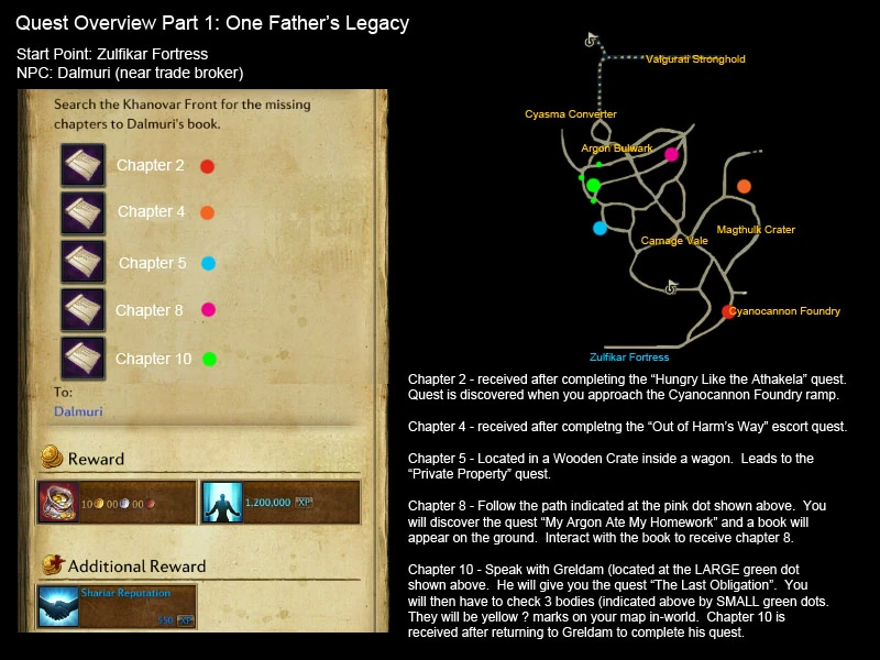 habe mal eine Frage bezüglich der Quest oben, ich soll die fehlenden Kapitel von Dalmuris Buch finden (Kapitel 2,4,5,8 und 10). Kapitel 2 habe ich schon aber wo finde ich die anderen Kapitel (oder kommen die Questbedingt?). Die Quest bekommt Ihr bei der Khanovarfront in der Zulfikarfestung und dort (also im Khanovarfromt gebiet) müsst Ihr auch suchen.