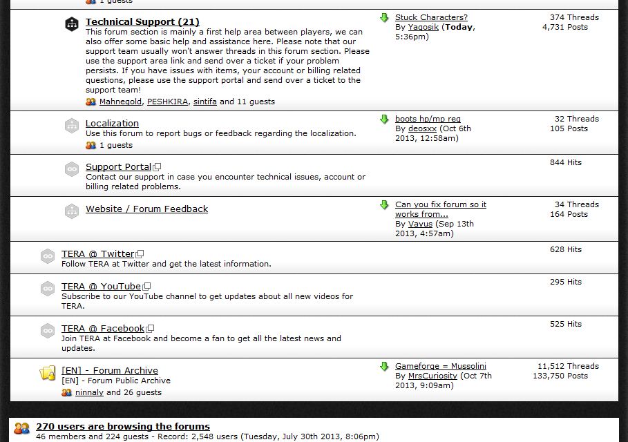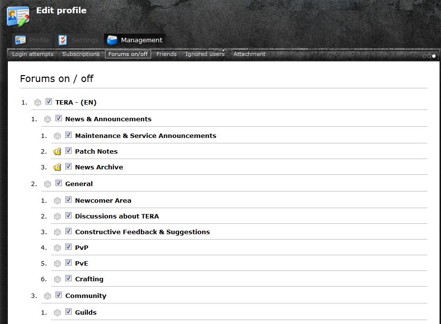 Now go to the sub-menu named "Forums on/off". In this news page, you will have a list of all section existing on the Tera board with checkboxes on the left side: