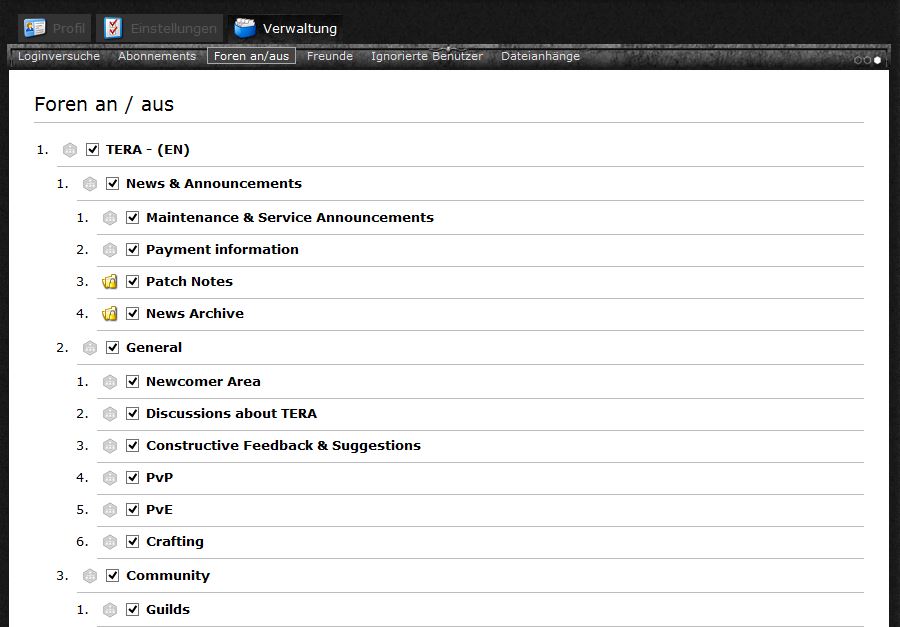 Wie ihr sicherlich schon mitbekommen habt, existiert für Tera nur ein Forum für die gesamte europäische Community. Daher besteht dieses Forum aus mehreren Unterbereichen (Englisch, Deutsch und Französisch). Da diese Bereiche auf Dauer störend sein könnten oder die Übersichtlichkeit des Forums beeinflussen, möchte ich euch gerne erklären, wie ihr die unnötigen Bereiche ausblenden könnt.