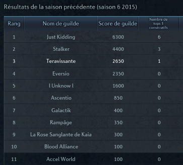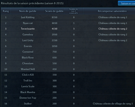 les 10 premières guildes classées en fin de saison 6, profitent d'une Forteresse volante du jeudi 13 août au merc. 9 sept. 15.