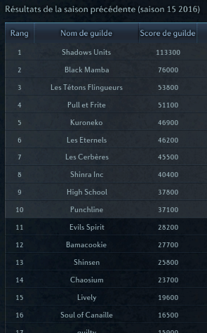 - septembre 2016, l’expérience Killian ne s’avère pas concluante, l’esprit compétitif et l’irrespect rebutent Chikiline et Hasmina (Roxane) qui reviennent sur server FR. C’est alors qu’Hasmina (Roxane) se consacre au sauvetage de la guilde : « je constate qu’aujourd’hui (19/09/2016)la guilde est au plus bas. Je suis connectée tous les jours et à part certains joueurs qui passent juste faire un coucou et un corsaire vite fait je me retrouve quasi seule toute la journée ».