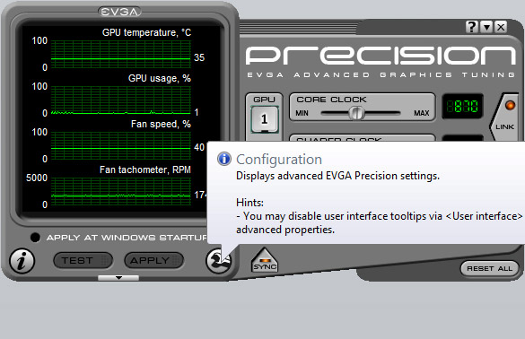 Danach startet ihr EVGA Precision und klickt auf den Schraubenschlüssel um das Programm zu konfigurieren.