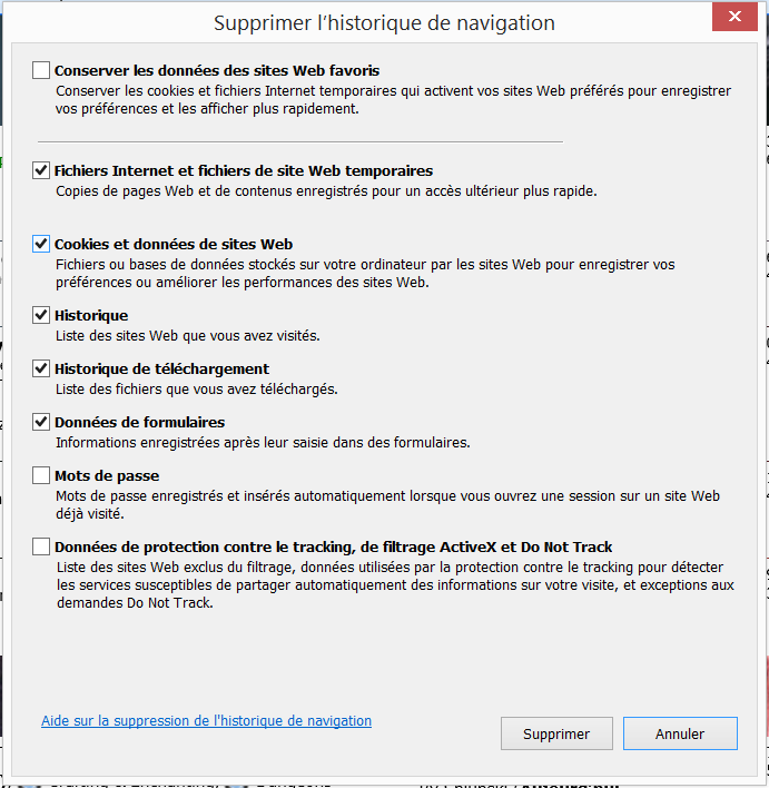 Ici, décochez la case 'Conserver les données des sites web favoris' et 'Données de protection contre le tracking, de filtrage ActiveX et Do Not Track'. Le reste peut être coché. A noter que si vous avez des mots de passe enregistrés et que vous souhaitez les conserver, il vaut mieux laisser décocher la case 'Mot de passe'.