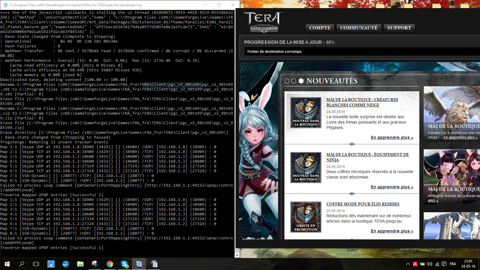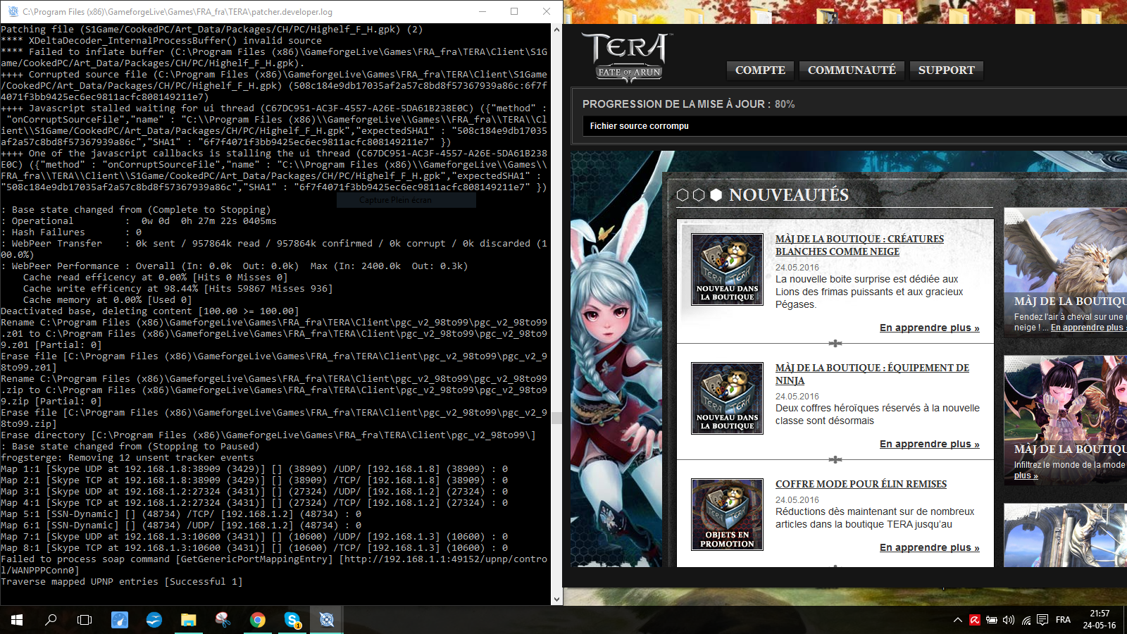 J'ai voulu démarrer Tera et y joué mais je me suis rendu compte qu'il y avait une mise a jour alors j'ai attendu et ça c'est bloqué a 80% et il était écrit "fichier corrompu" alors j'ai chercher sur le forum et j'ai ré-éditer le launcher avec /window et le chemin de localisation de Tera puis j'ai démarrer en mode "Debug", une fenêtre est apparu avec des codes et maintenant je fais quoi ?